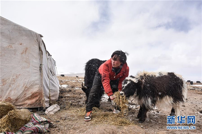 2月22日,才巴拉加在麥雄灘的帳篷前給牛犢喂飼料。新華社記者吳剛攝