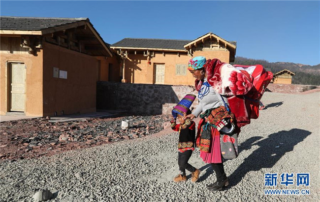 在昭覺縣三河村易地扶貧安置點,馬海阿依帶著女兒搬進(jìn)新居(2月11日攝)。2月11日,三河村首批29戶、168人告別居住多年的土坯房,搬入易地扶貧安置點的新家。新華社記者 江宏景 攝