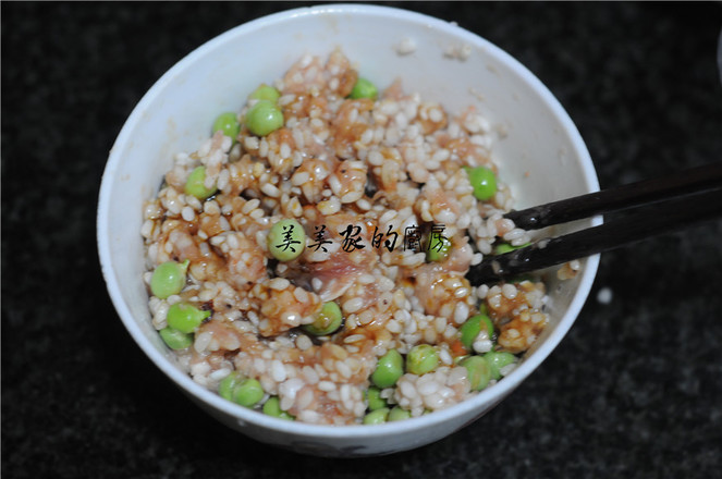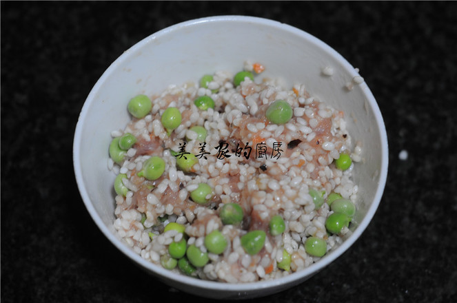 2.泡好的糯米從水里撈出來(lái),加入青豆和豬肉末。
