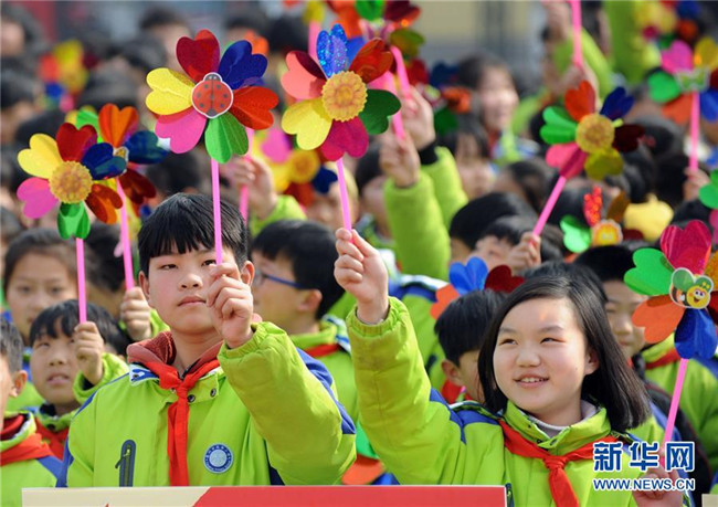2月25日,安徽省亳州市風(fēng)華桐鄉(xiāng)路小學(xué)的學(xué)生們?cè)谛聦W(xué)期主題活動(dòng)上舞動(dòng)風(fēng)車。 新華社發(fā)(張延林 攝)
