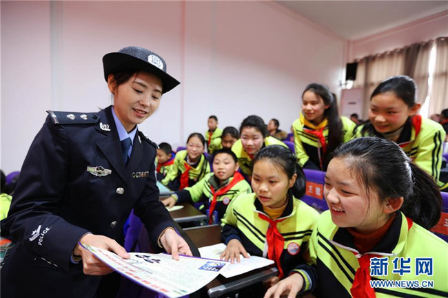 2月25日,在貴州省赤水市第三小學(xué),民警在開學(xué)第一課上給學(xué)生們講解校園安全知識(shí)。 新華社發(fā)(王長(zhǎng)育 攝)