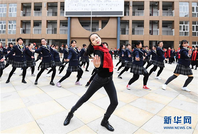 2月25日,貴州省貴陽(yáng)市南明區(qū)甲秀高中的師生在開學(xué)主題活動(dòng)上表演“快閃”節(jié)目《我和我的祖國(guó)》。新華社發(fā)(趙松 攝)