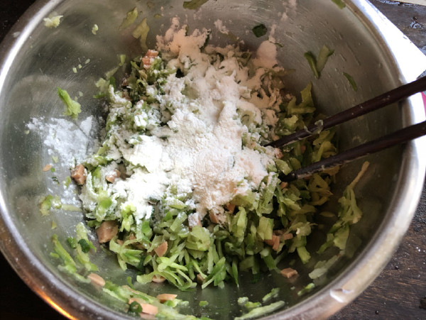 3.把蘿卜絲擠干水分,加入提前切好的火腿炒丁、雞蛋、白胡椒粉、五香粉、雞粉、蔥花拌勻