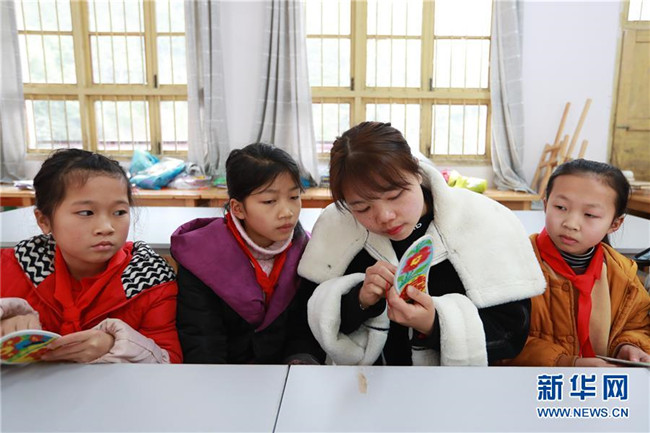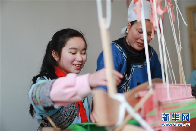 2月26日,在榕江縣水尾水族鄉(xiāng)中心學(xué)校,一名學(xué)生在向水族民間藝人學(xué)習(xí)織布。近年來,貴州省黔東南苗族侗族自治州榕江縣水尾水族鄉(xiāng)倡導(dǎo)水族文化進(jìn)校園,深受學(xué)生喜愛。新華社記者劉續(xù)攝