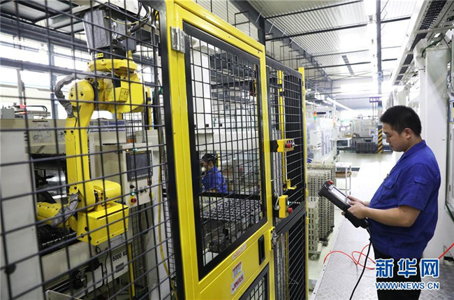 在位于重慶永川鳳凰湖工業(yè)園的重慶西源凸輪軸有限公司,工作人員在調試自動化生產設備(2018年7月31日攝)。新華社記者王全超攝