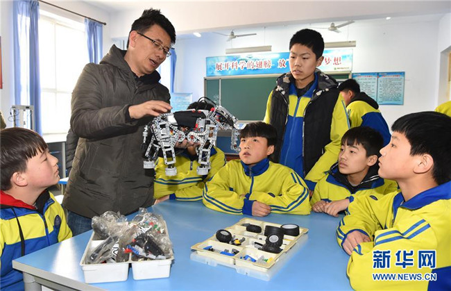 2月28日,在石家莊市藁城區(qū)韓家洼中學(xué),教師為學(xué)生講解“機(jī)器人”組裝技巧。 新華社發(fā)(張曉峰 攝)