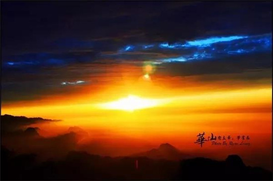 此時,但見夜幕自東方悄然隱退,晨曦初露,漸漸霞光瑰麗,云源奔涌。瞬間,一輪火球噴薄而出,繼而光芒四射,氣象萬千,整個世界大放光明,游人身心為之一振。待云霧散盡,蒼松翠柏,則更加清麗悅目,美妙神奇。故而,游名山者必登華山,登華山者必觀日。