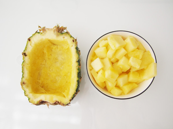 5.等待蒸米飯的時候,準(zhǔn)備其他食材。將菠蘿果肉挖出來,切成丁
