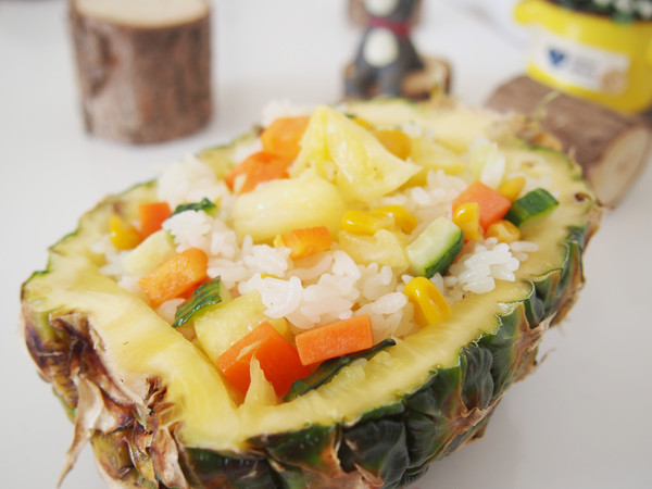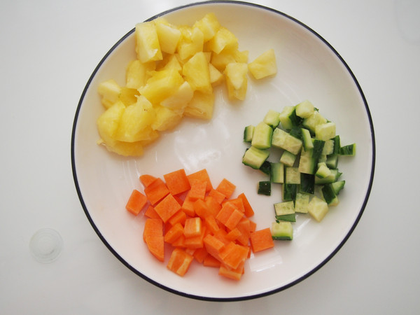 主料:菠蘿100克 胡蘿卜50克 黃瓜50克 甜玉米粒50克 大米200克 清水180克