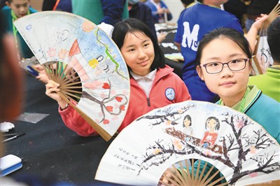 兩岸和平小天使在臺北民族小學的特色藝術課程上繪制扇面。