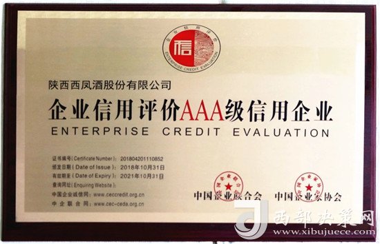 西鳳股份公司榮獲全國(guó)“AAA級(jí)信用企業(yè)”榮譽(yù)稱號(hào)