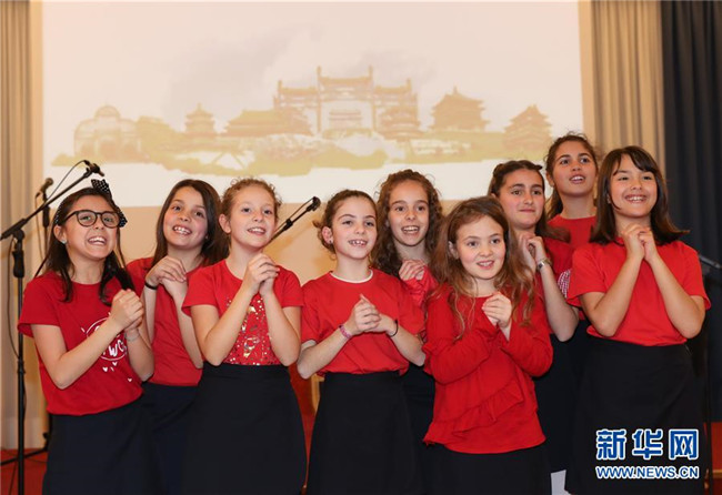 這是2019年2月8日,在意大利拉齊奧的古鎮(zhèn)蒂沃利,蒂沃利國(guó)立住讀學(xué)校的學(xué)生們?cè)谥袊?guó)春節(jié)慶?;顒?dòng)上給大家拜年。 新華社記者 程婷婷 攝
