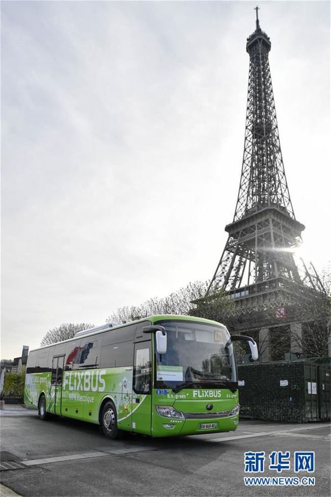 這是2018年4月10日在法國(guó)巴黎拍攝的中國(guó)宇通電動(dòng)客車(chē)。這輛59座電動(dòng)客車(chē)在法國(guó)巴黎至亞眠的城市間長(zhǎng)途客運(yùn)線路上運(yùn)營(yíng)。 新華社記者 陳益宸 攝