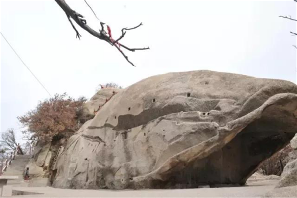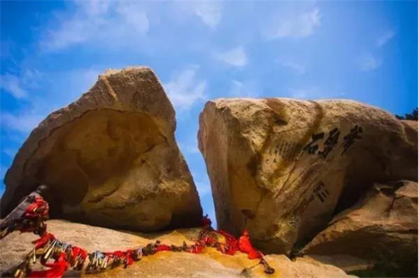 奇特之處:此奇石位于蓮花峰巔。一巨石一分為三,截面如刀削斧劈,石縫能容人出入,石下有凹凸,形似婦人仰臥的印痕,形象生動。