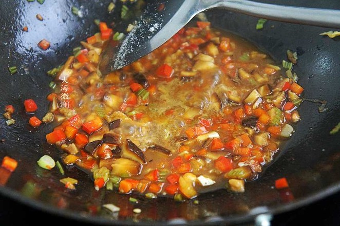 7.煎鍋內(nèi)再放少許油,爆香蔥姜,加入青紅椒、蘑菇翻炒