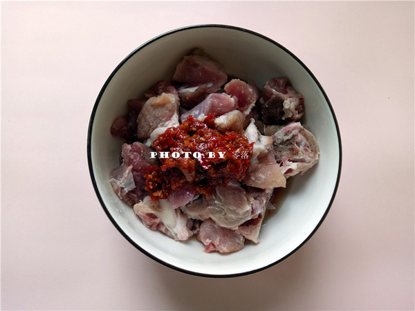 2.豬肉里調(diào)入料酒、醬油、鹽、糖、鮮椒醬、蠔油;