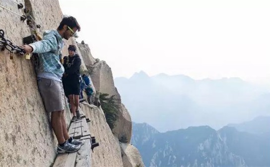 譯:這些令人暈眩的照片,拍的是中國陜西省一座旅游名山的游客正在通過建在峭壁上的極其狹窄且危險的棧道。