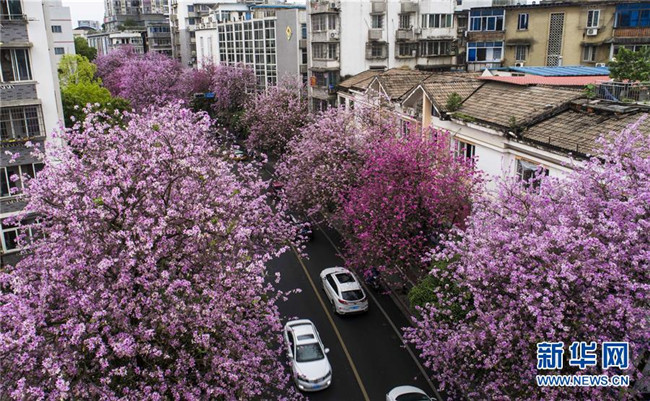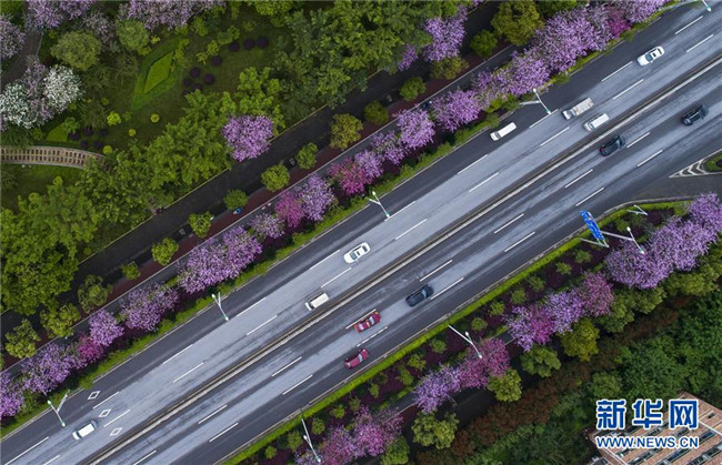 4月14日,在廣西柳州市彎塘路,車(chē)輛在開(kāi)滿(mǎn)洋紫荊的街道上行駛(無(wú)人機(jī)拍攝)。