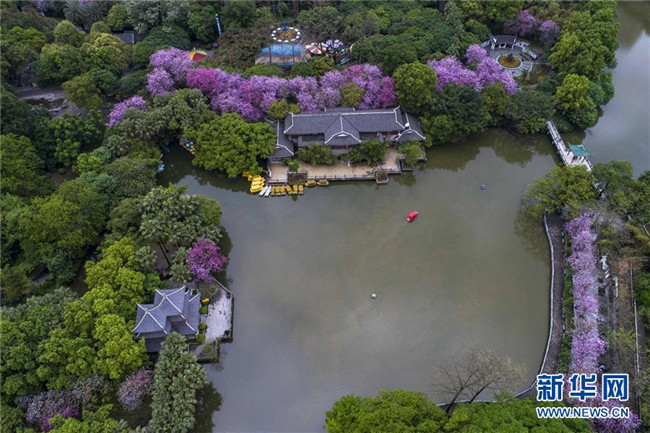 4月14日,在廣西柳州市柳侯公園,盛開(kāi)的洋紫荊把公園裝扮得格外美麗(無(wú)人機(jī)拍攝)。