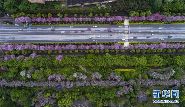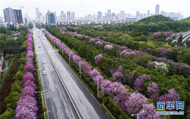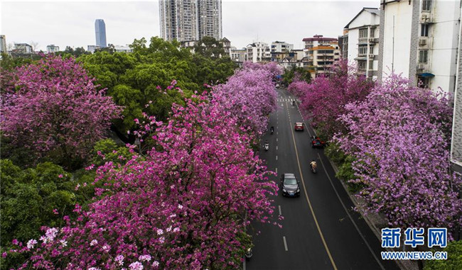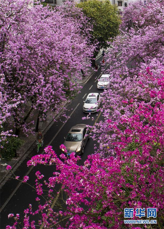當(dāng)日,一場(chǎng)大雨過(guò)后,廣西柳州市內(nèi)的洋紫荊開(kāi)得格外嬌艷。時(shí)下,柳州市區(qū)27萬(wàn)株洋紫荊進(jìn)入盛花期。 新華社記者 黃孝邦 攝