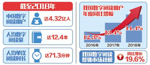 4月12日至14日,第五屆中國數(shù)字閱讀大會在杭州召開。會上發(fā)布的《2018年度中國數(shù)字閱讀白皮書》顯示,截至2018年,中國數(shù)字閱讀用戶總量達到4.32億,人均數(shù)字閱讀量達到12.4本,人均單次閱讀時長達71.3分鐘。我國數(shù)字閱讀整體市場規(guī)模已達到254.5億元,同比增長19.6%,大眾閱讀市場規(guī)模占比逾九成,是產業(yè)發(fā)展主導力量。