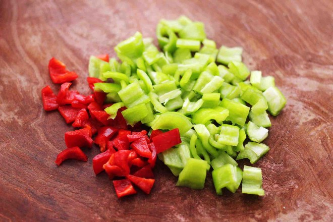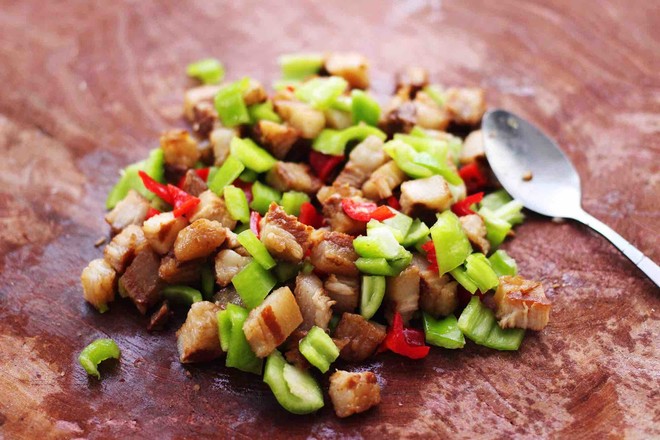 5.把切丁的青紅椒和鹵肉丁用勺子翻拌均勻備用,加點香菜味道會更好吃哈。