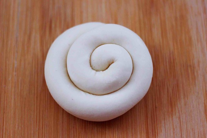 12.然后把長條從一頭開始卷起,卷到最后把尾端壓在面團底下。