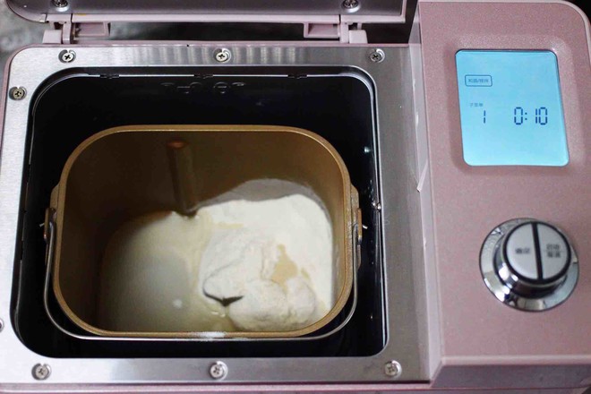 6.面包桶里加入中筋面粉,然后再加入酵母和清水,啟動?xùn)|菱面包機的一個和面程序。