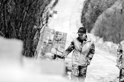 上午10時(shí),記者跟隨參與長(zhǎng)城修繕的工作人員向箭扣長(zhǎng)城進(jìn)發(fā)。經(jīng)過(guò)近1個(gè)小時(shí)的攀登,記者們都已經(jīng)疲憊不堪,工作人員卻依然步履輕松,“我們每天都要上下爬一趟,已經(jīng)習(xí)慣了。”一位工作人員說(shuō)。終于抵達(dá)151敵樓,蜿蜒于山脊線上的箭扣長(zhǎng)城展現(xiàn)出了它的雄姿。在151的南側(cè),工人師傅正在對(duì)一段城墻進(jìn)行修繕,他們搬起一塊塊幾十斤重的舊城磚,小心翼翼地把它鋪到城墻面上,再用橡膠錘敲打緊實(shí)。