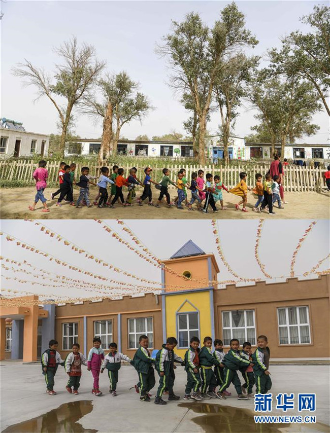 拼版照片:上圖為新疆于田縣達里雅布依鄉(xiāng)小學的學生走在校園里(2018年9月5日攝);下圖為學生們在達里雅布依小鎮(zhèn)易地扶貧安置點的新校舍前(2019年3月20日攝)。新華社記者 胡虎虎 攝