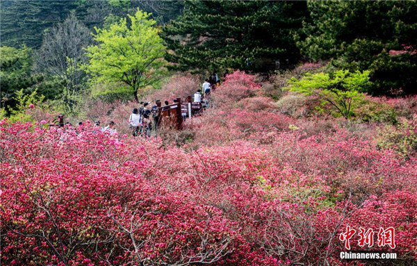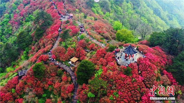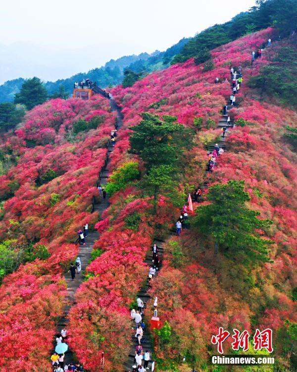 4月20日,游客在龜峰山的杜鵑花海游玩。近日,湖北省麻城市龜峰山的古杜鵑花盛開(kāi),大量游客前來(lái)賞花觀景。中新社記者 張暢 攝