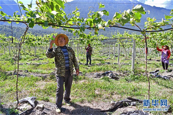 工人們在布巴村獼猴桃園內(nèi)進行人工授粉(4月13日攝)。新華社記者 李鑫 攝