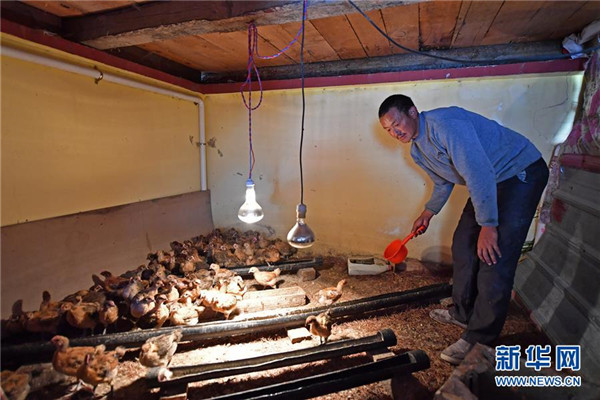 布巴村村民拉珠在自家雞舍里喂雞(4月13日攝)。新華社記者 李鑫 攝