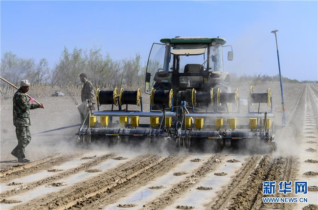 在新疆生產(chǎn)建設(shè)兵團(tuán)第六師共青團(tuán)農(nóng)場(chǎng)的棉花地中,一名農(nóng)機(jī)手正操縱一輛裝有北斗導(dǎo)航系統(tǒng)的多功能一體化無(wú)人駕駛精量播種機(jī)在田間播種(4月19日攝)。