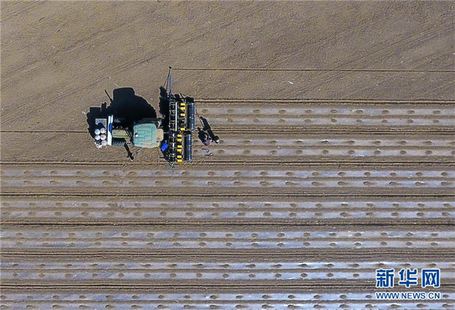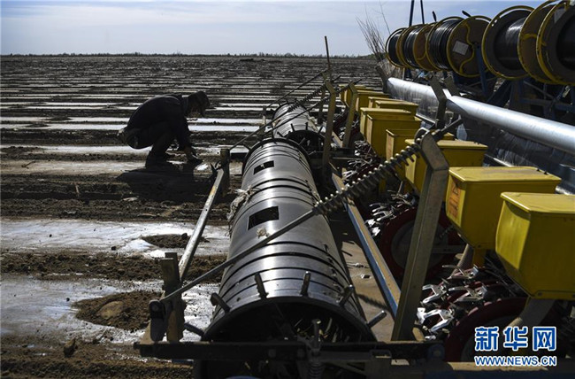 在新疆生產(chǎn)建設(shè)兵團(tuán)第六師共青團(tuán)農(nóng)場(chǎng)的棉花地中,一名農(nóng)場(chǎng)職工在一輛裝有北斗導(dǎo)航系統(tǒng)的多功能一體化無(wú)人駕駛精量播種機(jī)后檢查地膜鋪設(shè)情況(4月19日攝)。
