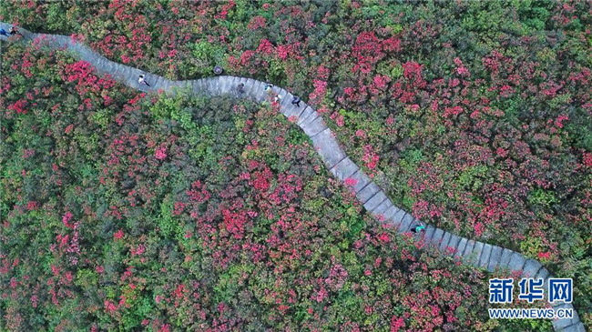 4月25日,游客在貴州省丹寨縣龍泉山景區(qū)觀賞映山紅(無(wú)人機(jī)拍攝)。暮春時(shí)節(jié),位于貴州省黔東南苗族侗族自治州丹寨縣龍泉山景區(qū)的映山紅陸續(xù)開放,紅遍山嶺,吸引眾多游客前來(lái)賞花觀光。 新華社記者 楊文斌 攝