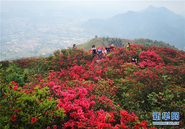 4月25日,游客在貴州省丹寨縣龍泉山景區(qū)觀賞映山紅(手機(jī)拍攝)。暮春時(shí)節(jié),位于貴州省黔東南苗族侗族自治州丹寨縣龍泉山景區(qū)的映山紅陸續(xù)開放,紅遍山嶺,吸引眾多游客前來(lái)賞花觀光。 新華社記者 楊文斌 攝