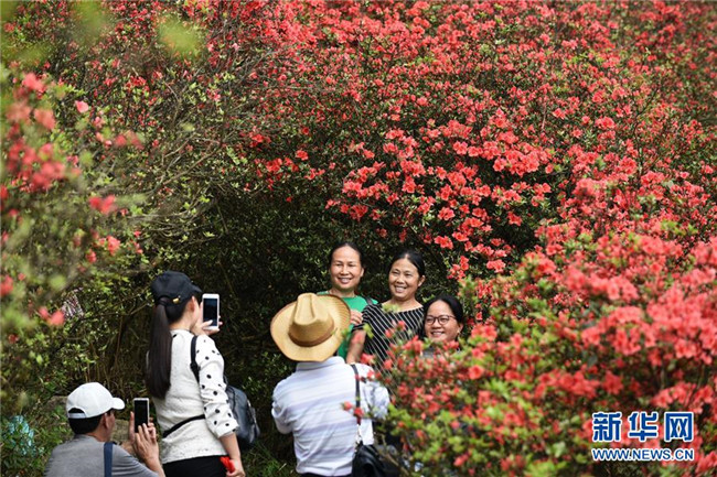 4月25日,游客在貴州省丹寨縣龍泉山景區(qū)的映山紅花間留影。暮春時(shí)節(jié),位于貴州省黔東南苗族侗族自治州丹寨縣龍泉山景區(qū)的映山紅陸續(xù)開放,紅遍山嶺,吸引眾多游客前來(lái)賞花觀光。 新華社記者 楊文斌 攝