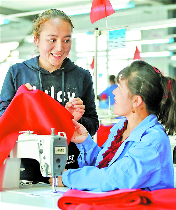4月19日,亞爾買(mǎi)里村村民阿瓦汗·艾尼瓦爾(左)在車(chē)間與工人交流。如今,她已成長(zhǎng)為村辦工廠的廠長(zhǎng)助理。周鵬 攝