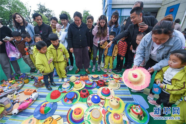 4月28日,家長帶著孩子們?cè)谔暨x手工作品。 新華社記者 徐昱 攝