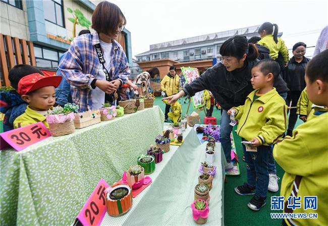 4月28日,家長帶著孩子們?cè)谔暨x用廢舊罐子等作花盆的小盆栽。 新華社記者 徐昱 攝
