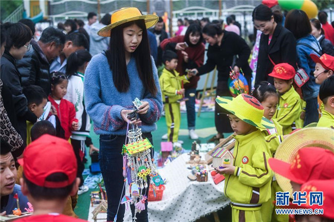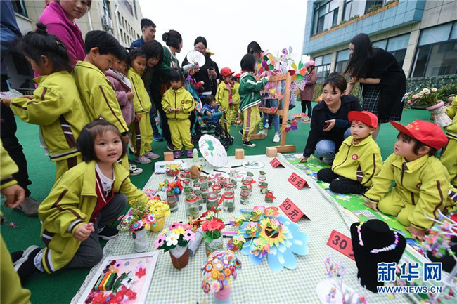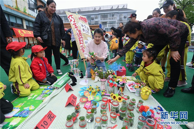 當(dāng)日,浙江省長興縣畫溪街道包橋中心幼兒園舉辦校園義賣節(jié)。10多個(gè)攤位上擺放著家長和孩子一起用廢舊的玻璃瓶、雪糕棍、紙盒、紐扣等廢舊材料制作而成的小木屋、迷你小盆栽、紐扣花束、風(fēng)車等手工作品,孩子們以班級(jí)為單位進(jìn)行手工作品義賣,所得款項(xiàng)將全部用于社區(qū)公益環(huán)保活動(dòng)。主辦方介紹,希望通過這樣的活動(dòng),倡導(dǎo)廢物利用和綠色低碳的生活理念。