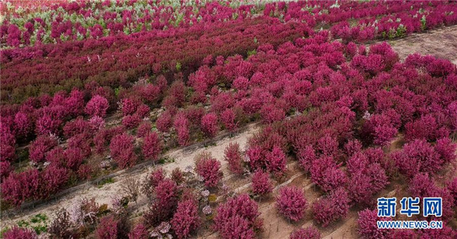 呼圖壁縣二十里店鎮(zhèn)北美海棠園內(nèi)的海棠花競相開放(4月28日無人機(jī)拍攝)。
