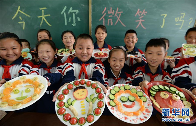5月7日,河北省邯鄲市光明南小學(xué)的學(xué)生展示自制的“果蔬笑臉”。新華社發(fā)(郝群英 攝)