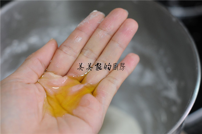 6.揪起一小團面團,稍微拉扯成扁圓形,放入燒至5成熱的油鍋中,迅速用筷子將面團往兩邊拉,扯成橢圓形、中間留出深深的凹洞。