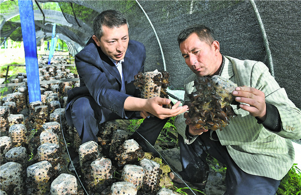 4月30日,新疆烏什縣委組織部駐阿克托海鄉(xiāng)庫(kù)木奇吾斯塘村“訪惠聚”工作隊(duì)隊(duì)員艾克熱木·艾麥提(左)在工作隊(duì)建立的黑木耳種植示范基地,為該村貧困戶講解黑木耳種植技術(shù)。約提克爾·尼加提 攝