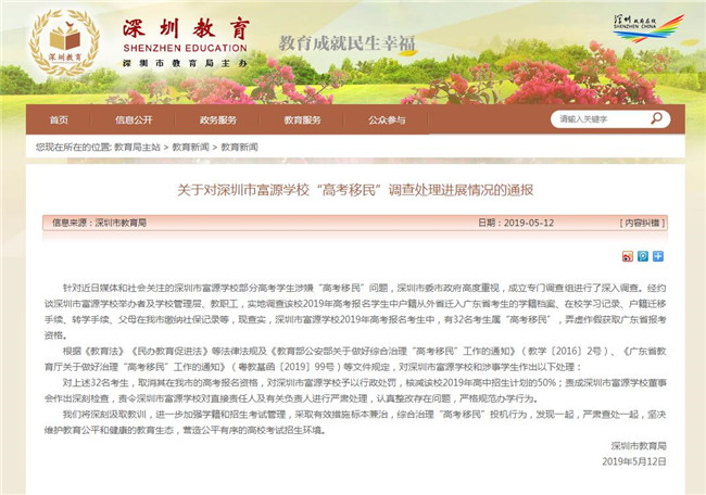 深圳市教育局網(wǎng)站12日發(fā)布《關(guān)于對深圳市富源學(xué)校“高考移民”調(diào)查處理進展情況的通報》(以下簡稱《通報》)?!锻▓蟆分赋觯航?jīng)查實,深圳市富源學(xué)校2019年高考報名考生中,有32名考生屬“高考移民”,弄虛作假獲取廣東省報考資格。將取消此32名考生在深圳市的高考報名資格。