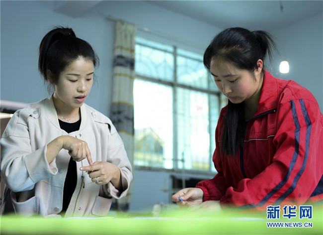 5月15日,在畢節(jié)市特殊教育學(xué)校,老師在用手語指導(dǎo)學(xué)生縫制床單。 新華社發(fā)(尚宇杰 攝)