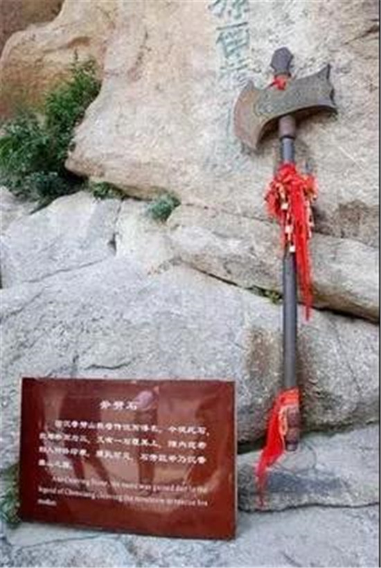 華山西峰就是《寶蓮燈》中沉香劈山救出三圣母的地方。翠云宮旁有一名為“斧劈石”的巨石,中間裂開,如同被斧劈開,旁邊還立著一柄長(zhǎng)把大斧。據(jù)說(shuō)是當(dāng)年沉香救母使用的神兵。