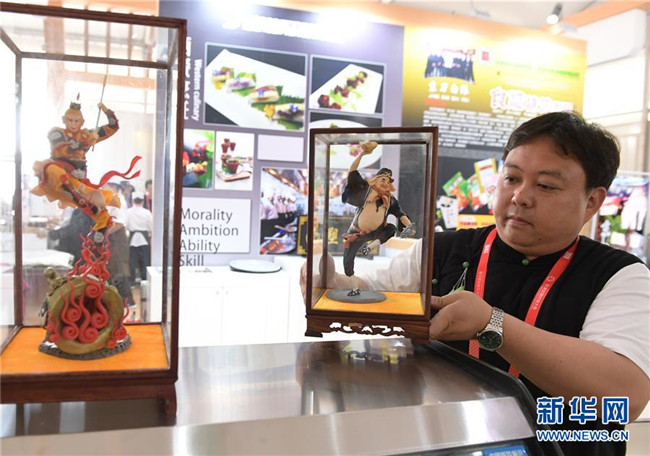5月16日,在北京奧林匹克公園,面塑藝人在擺放面塑作品。新華社記者 李賀 攝